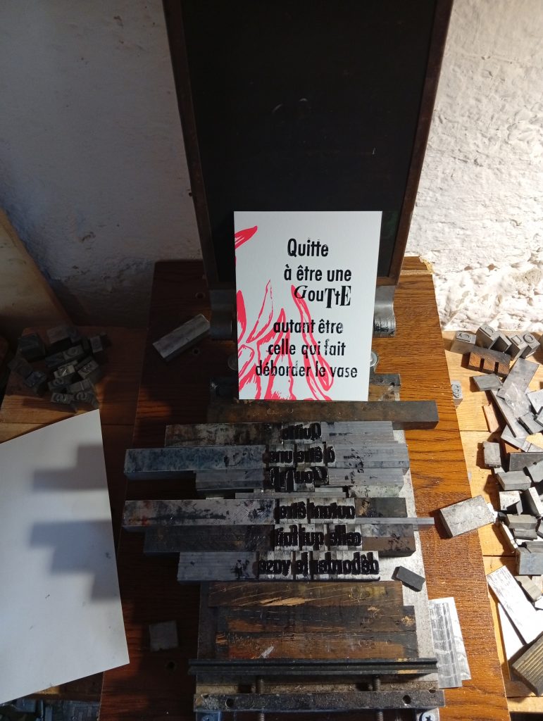 Le gros projet 2022 : un alphabet en Typographie. Chaque carte format 10×15 en 40 exemplaires / 3 couleurs. Puis une affiche sérigraphiée avec toutes les lettres en 100 exemplaires / 3 couleurs. Merveilleusement tirée à l’Atelier Code B (Aurel – 26)